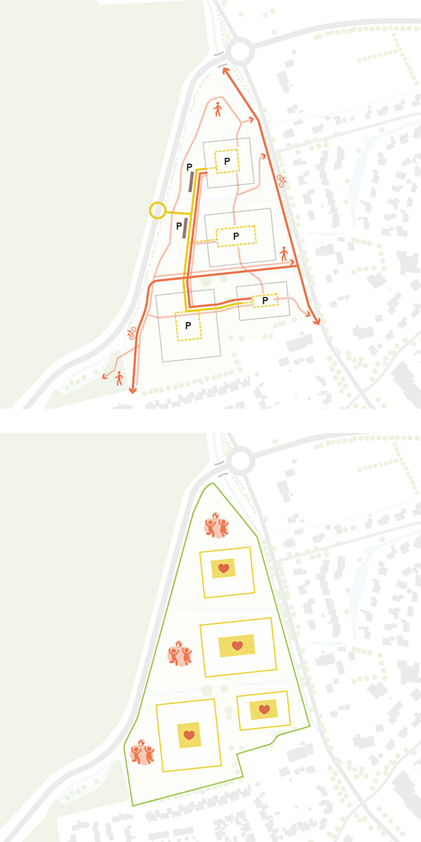 Het fijnmazige netwerk van voetpaden sluit aan op bestaande routes en voorzieningen in de omgeving. Zo wordt het landschap onderdeel van de brede leefomgeving. Het grootste deel van het landschap rondom de woonclusters is autovrij.