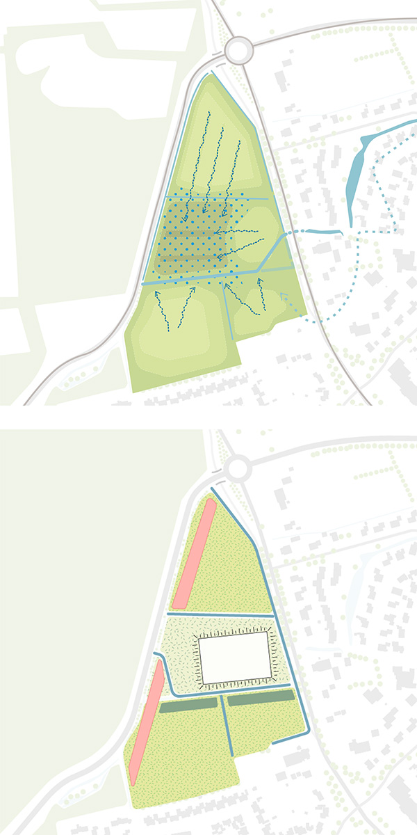 Vanaf de eerste ontwerpschetsen zijn water en bodem sturend geweest. De bodem bestaat hier uit potklei, een keiharde laag waar water niet doorheen dringt. Bestaande watergangen en het microreliëf van hoogtes en laagtes worden behouden.
